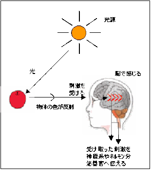 どうして好きな色によって心理状態がわかったりするのでしょうか? 色とは人間にとって「刺激」です。光源(太陽や蛍光灯など)から発せられる光が物体にあたり、反射した光の一部が目に入ります。その光が網膜を刺激して生じた興奮が大脳へと伝えられ、何色だ、という認識がされます。